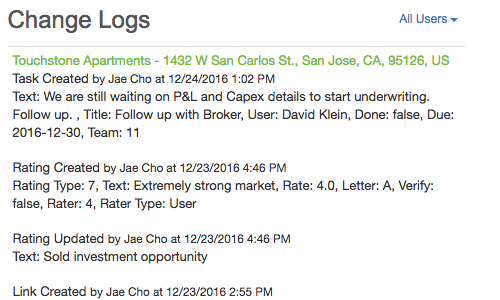When your team members are updating property information, Reiance creates a log of changes. The change log is shown with the property. With the change logs you will be able to eaily see the progress and changes happnening with your real estate investments.